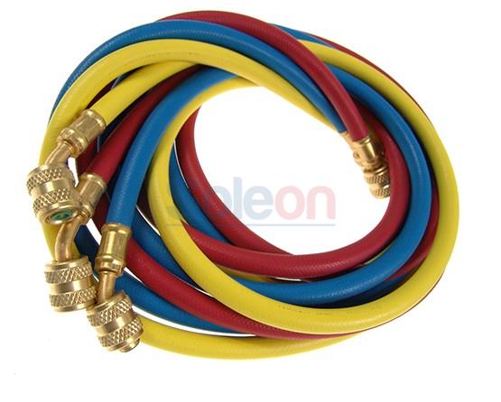 Súprava 3 plniacich hadíc (červená + žltá + modrá) - dĺžka 180 cm. - bez guľového ventilu, 45° stranou a závitom 1/4“ SAE, na priamej strane s 1/4"SAE.