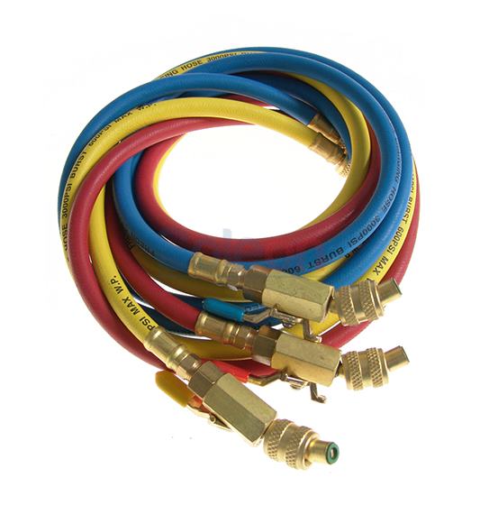 Súprava 3 plniacich hadíc (červená + žltá + modrá) - dĺžka 180 cm. - s guľovým ventilom, 45° stranou a závitom 1/4“ SAE, na priamej strane s 1/4"SAE.