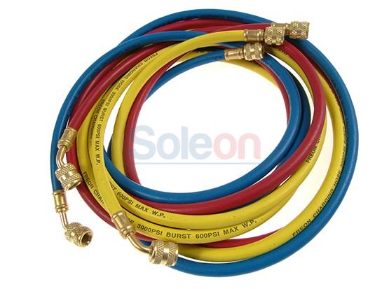 Súprava 3 plniacich hadíc (červená + žltá + modrá) - dĺžka 240 cm. - bez guľového ventilu, 45° stranou a závitom 1/4“ SAE, na priamej strane s 1/4"SAE.