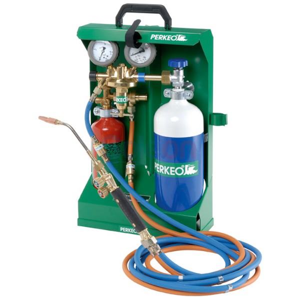 Súprava na spájkovanie propán-kyslík ECONOMY s naplniteľnými oceľovými fľašami - podľa DIN EN 962/DIN EN ISO 11117, UVV VGB 21 a TRG 280 - Schválené TÜV. S odolnou kvalitnou rukoväťou a spájkovacou vložkou, extra flexibilným balíkom gumených hadíc (3m) s individuálnymi tlmičmi spätného rázu podľa DIN EN 559 / ISO 3821 a DIN EN 730, naplniteľnou 2L kyslíkovou oceľovou fľašou a naplniteľnou 0,425 kg oceľovou fľašou na propán. Dodávka obsahuje horák veľkosť 3 (spájka 2-4mm).